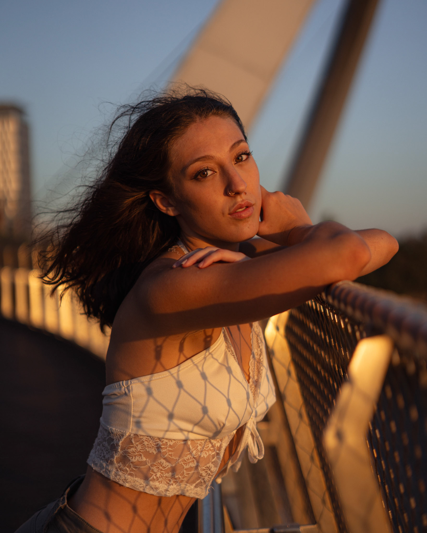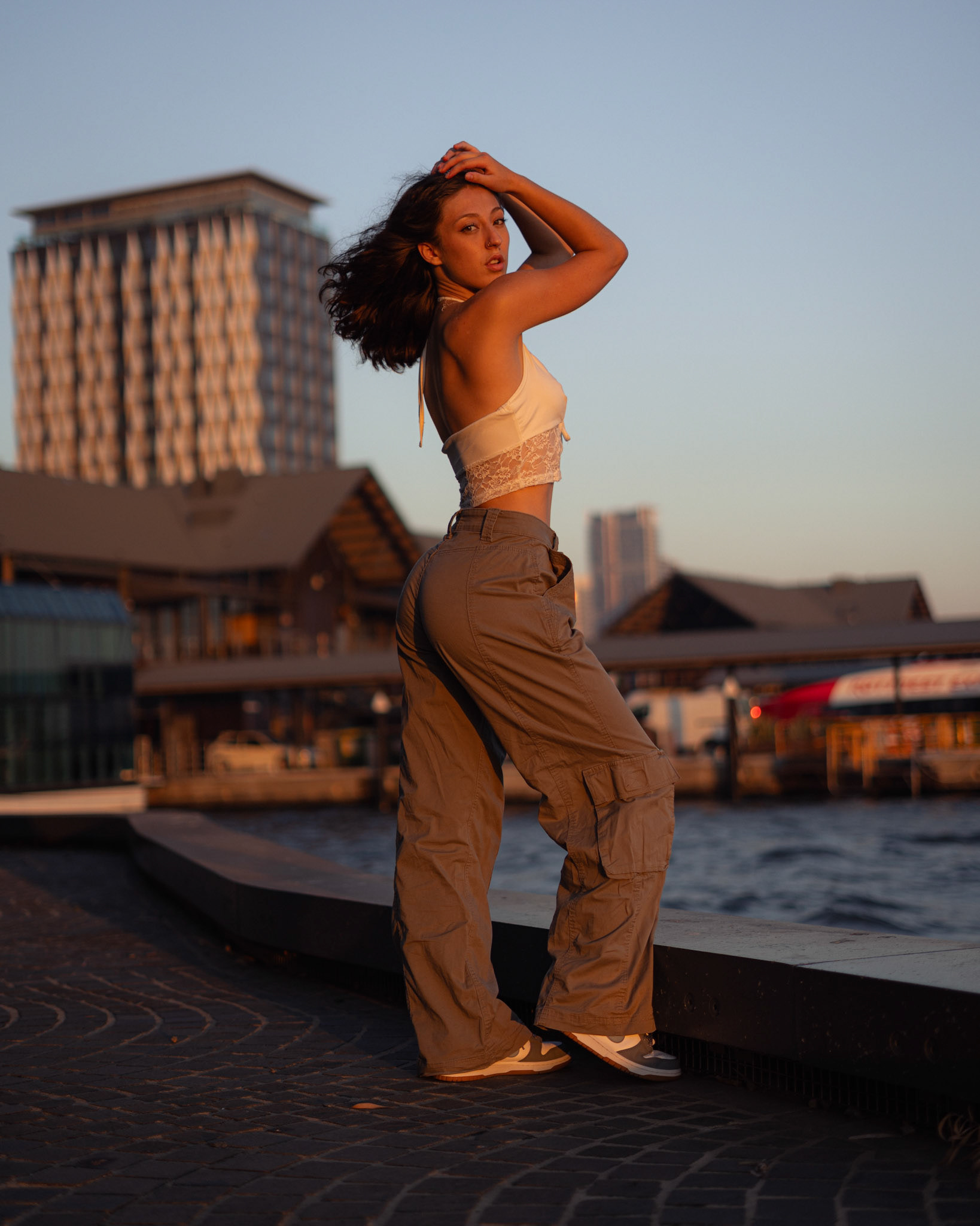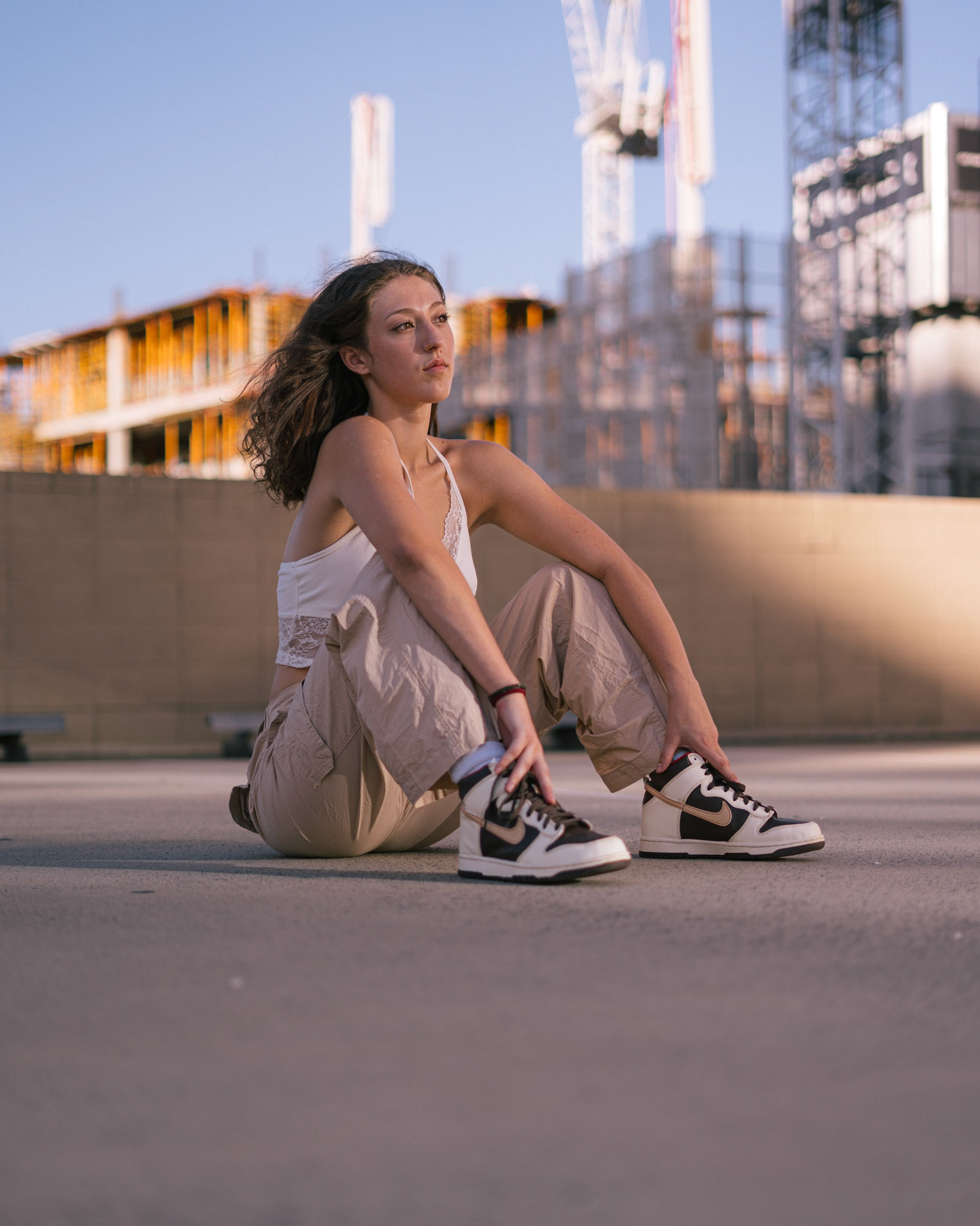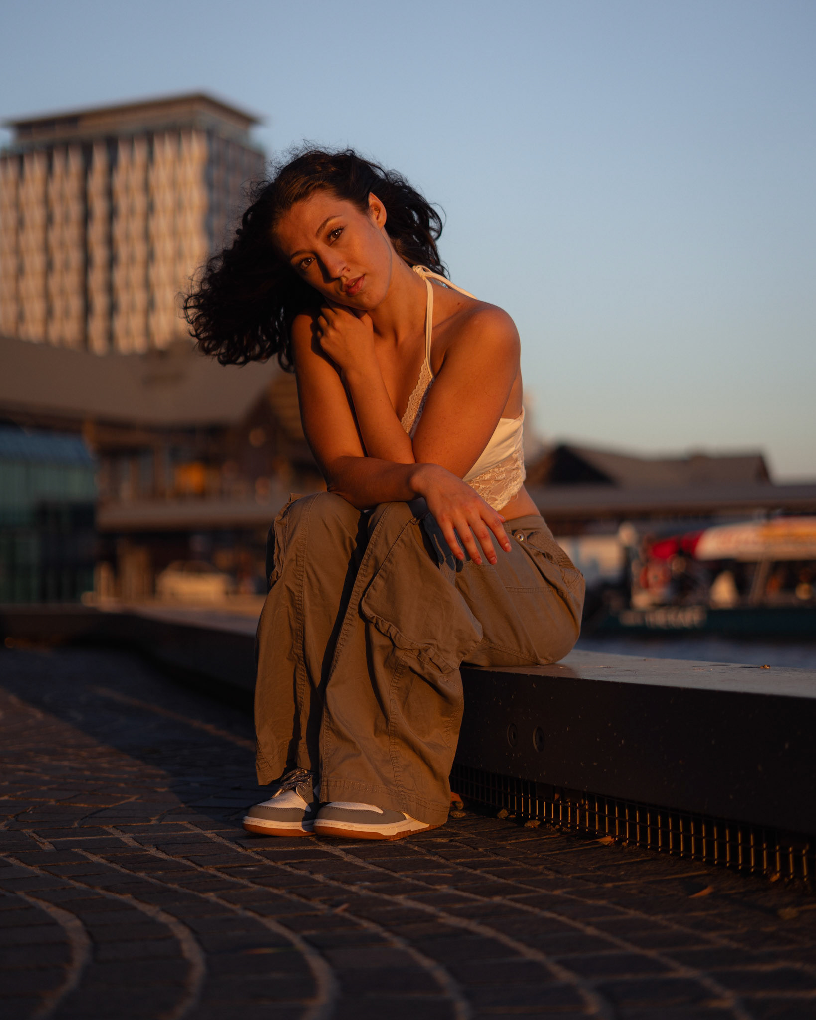 "Navigating the urban labyrinth, amidst the towering skyscrapers, she's drawn to the golden hour's gentle glow like a moth to flame..."