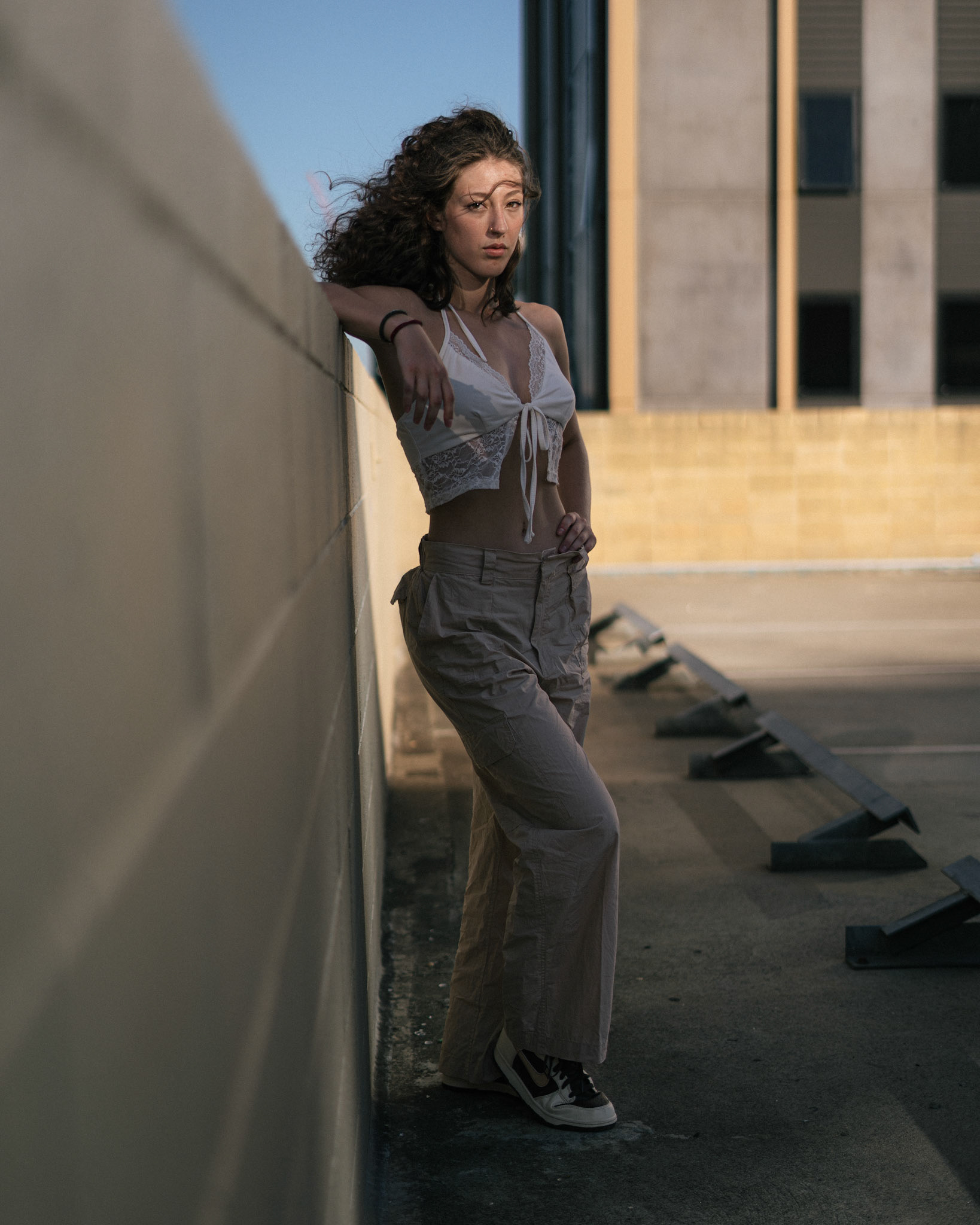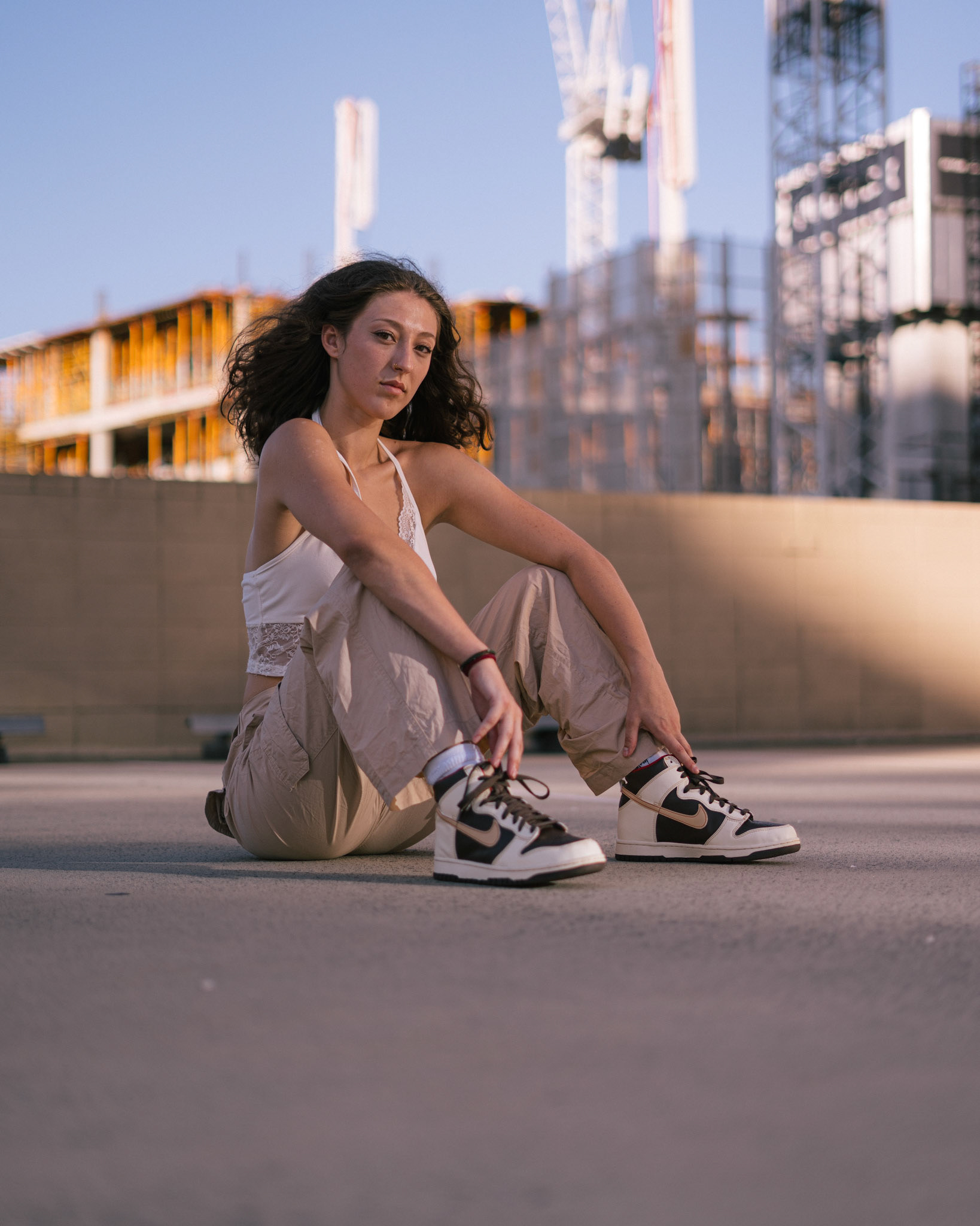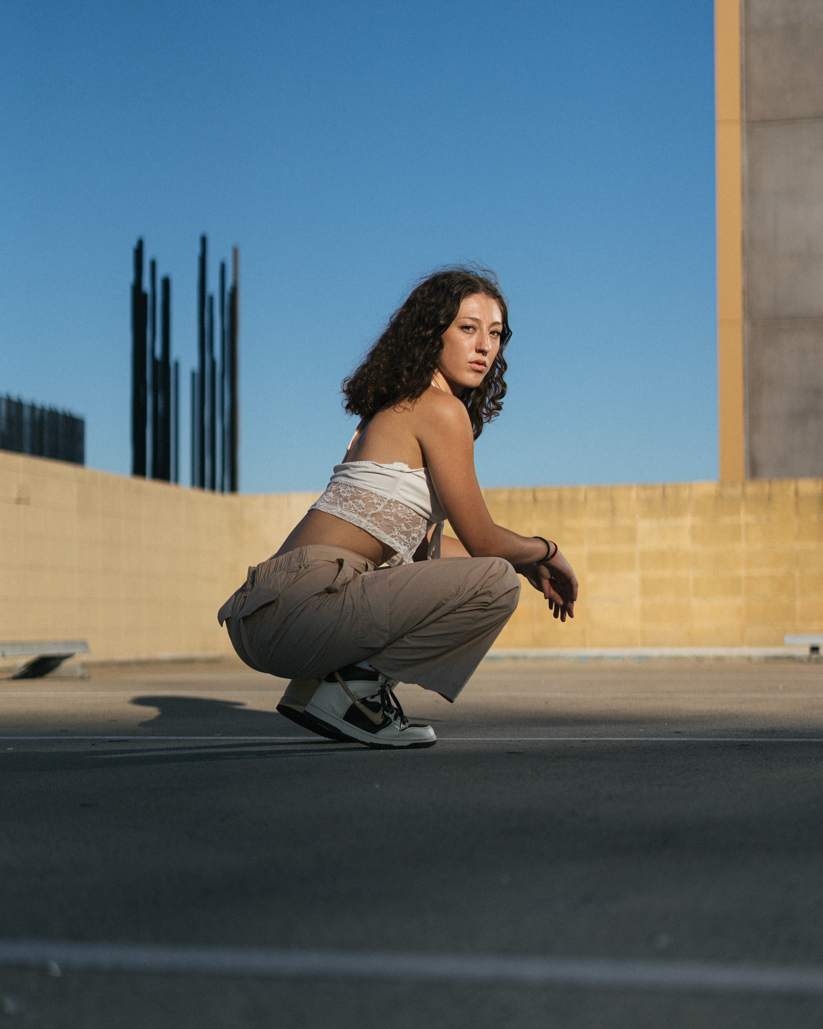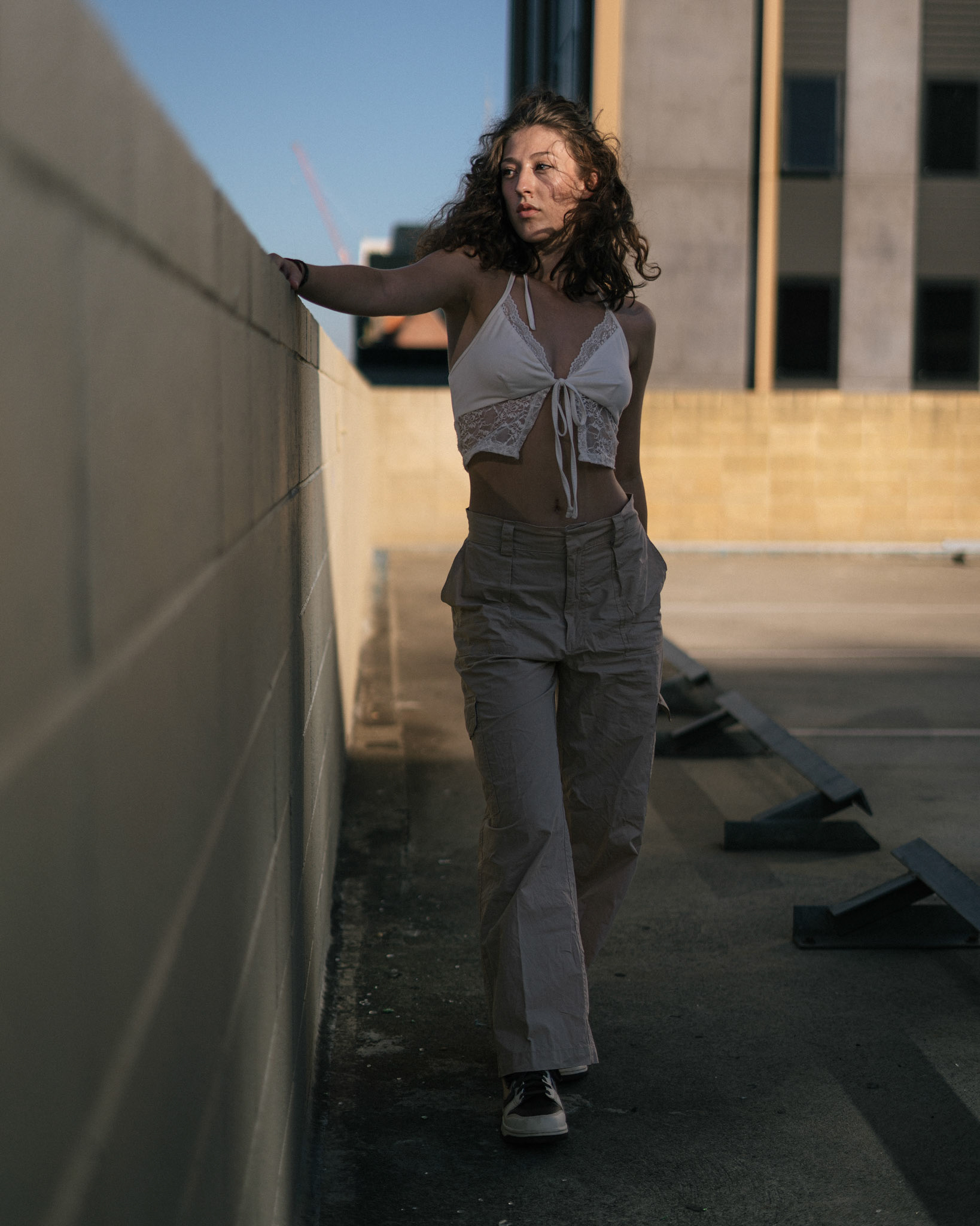 "Navigating the urban labyrinth, amidst the towering skyscrapers, she's drawn to the golden hour's gentle glow like a moth to flame..."